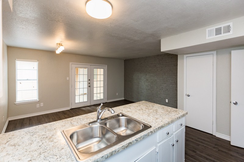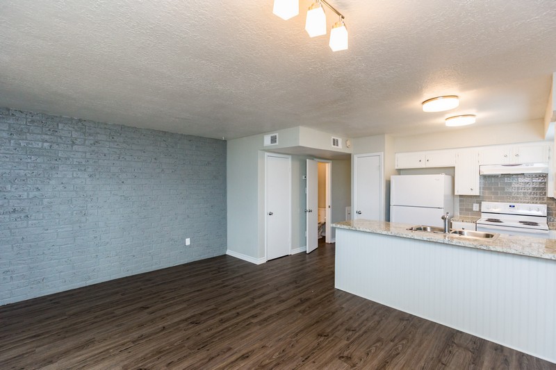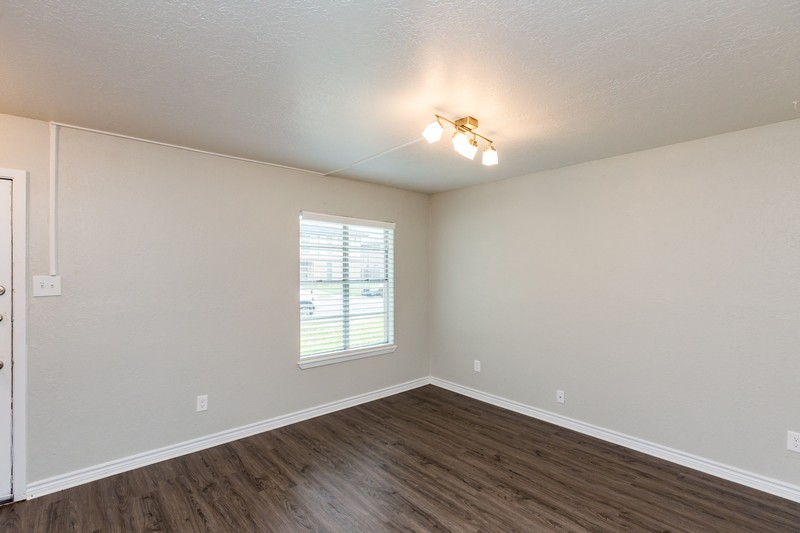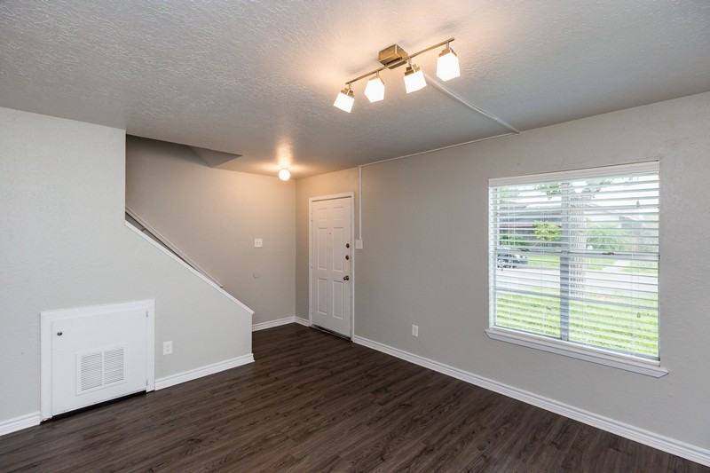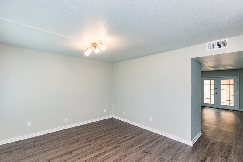 Living space boasts french door patio opening to covered space overlooking the small yard. Opens beautifully to the kitchen space! Check out that awesome accent wall.