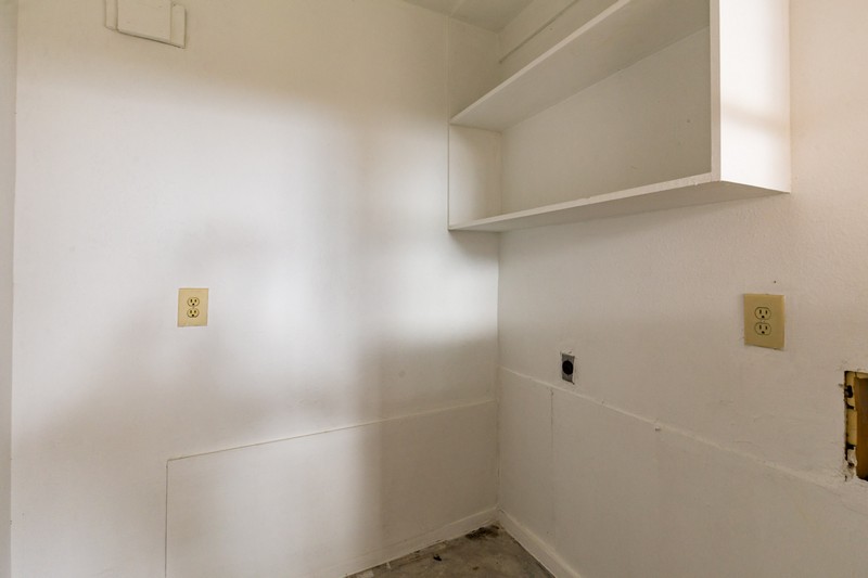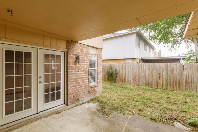 Covered patio and french doors from the outside view. Laundry room! A peak at the one car garage space!