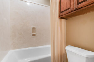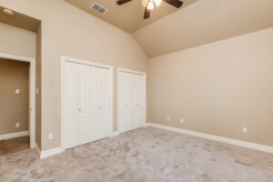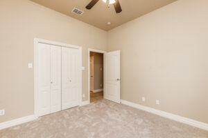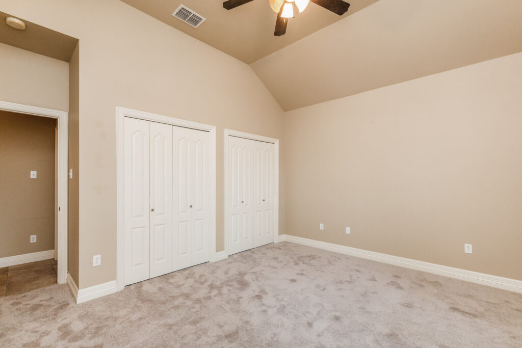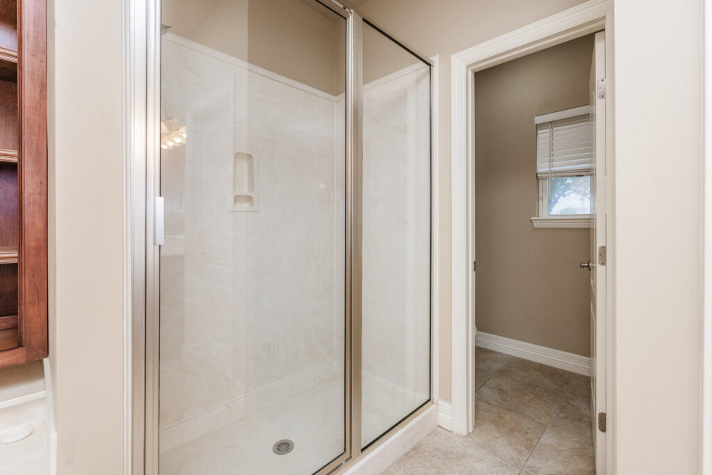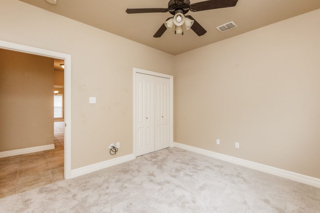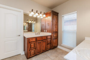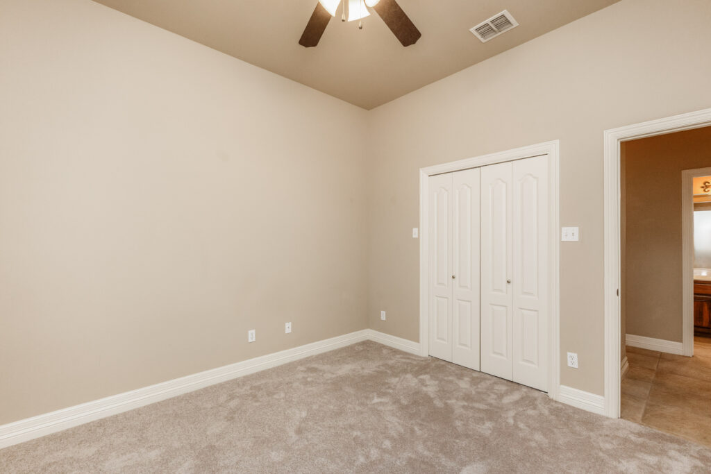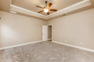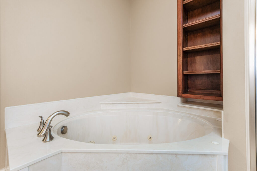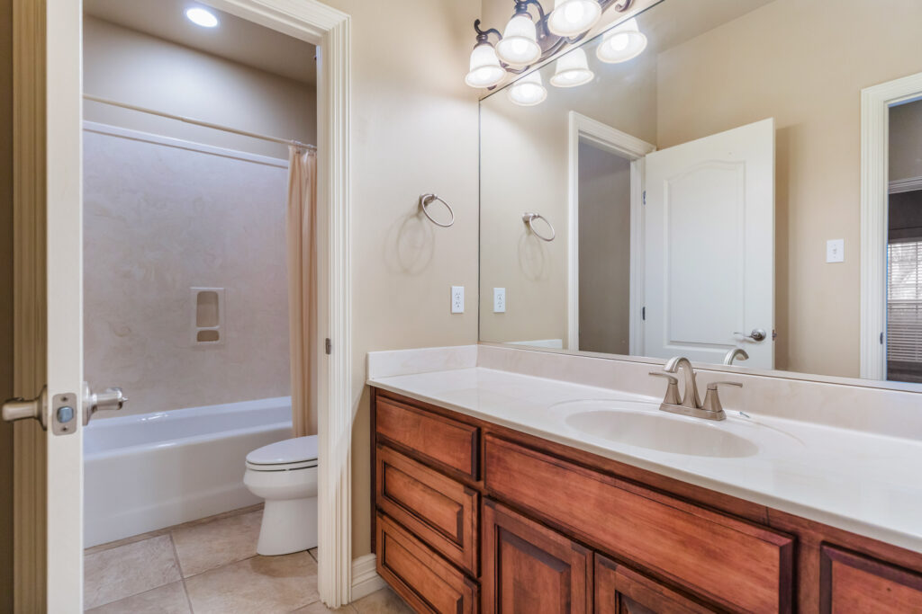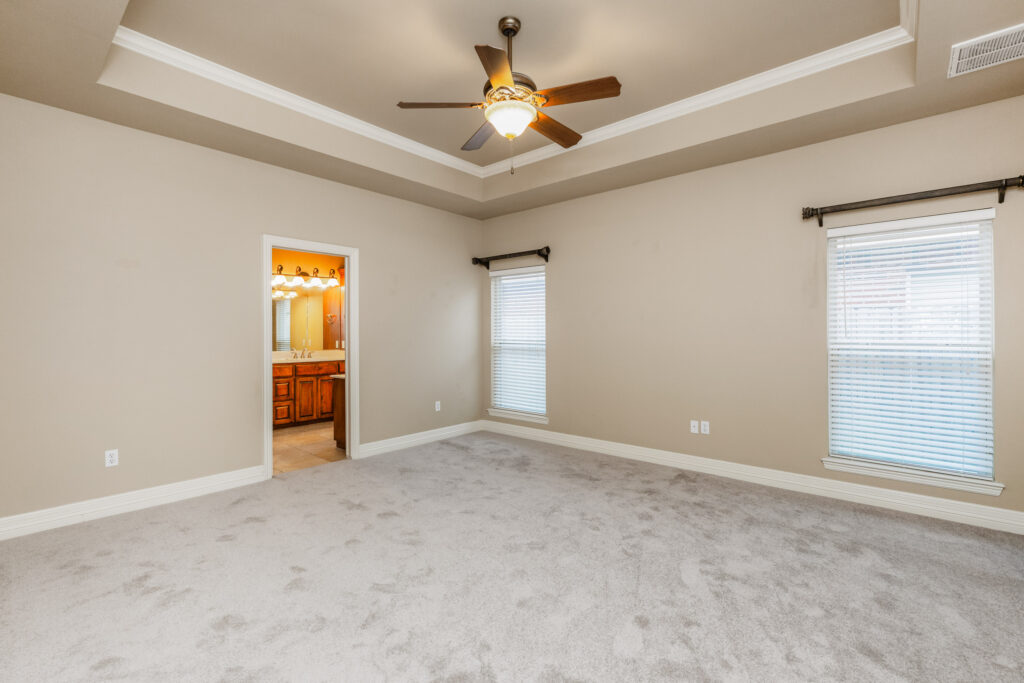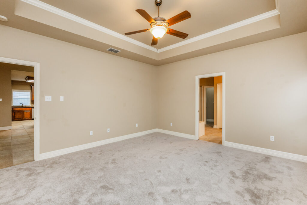 The primary bedroom, located just off the den, boasts a tray ceiling and an en-suite bath featuring dual vanities, a corner tub with built-in shelving, a walk-in shower, and a private toilet room. On the opposite side of the home, three secondary bedrooms share a well-appointed bathroom with a single vanity and tub/shower combo.