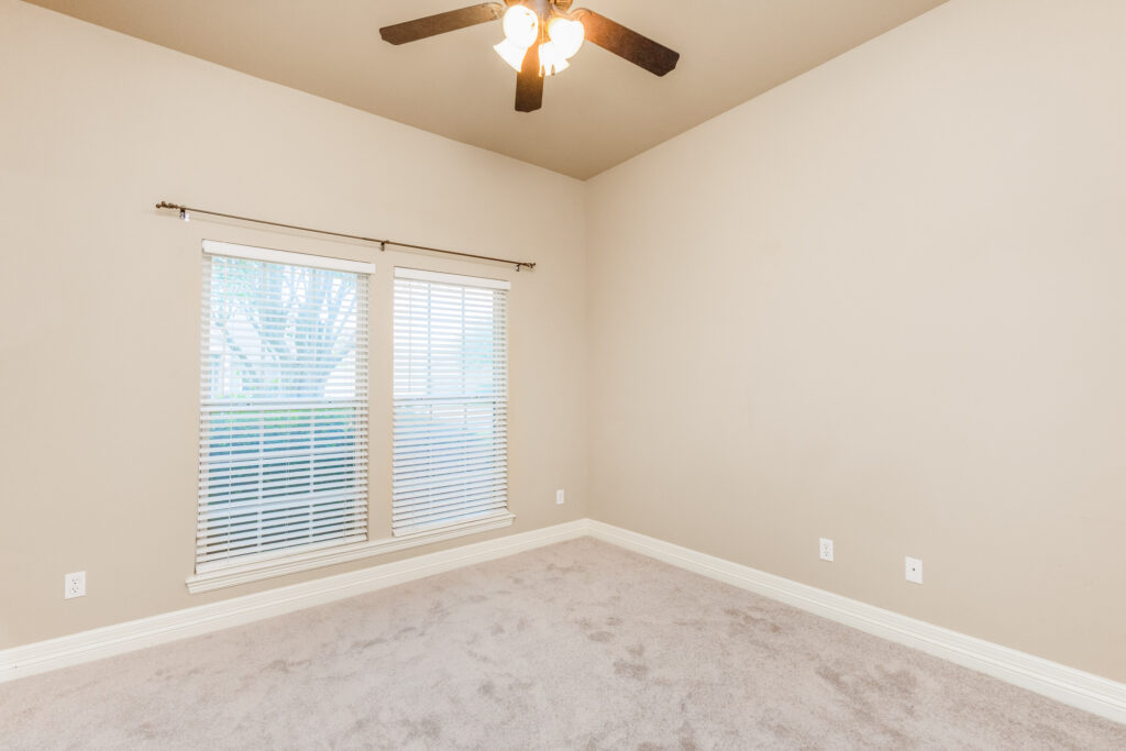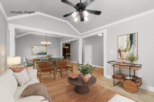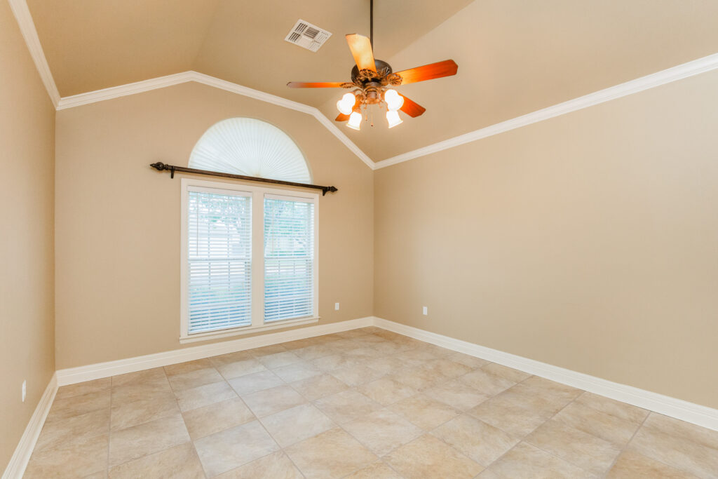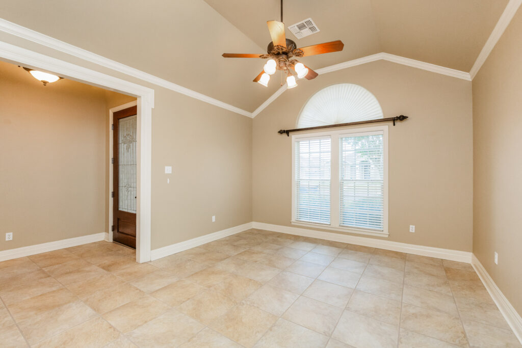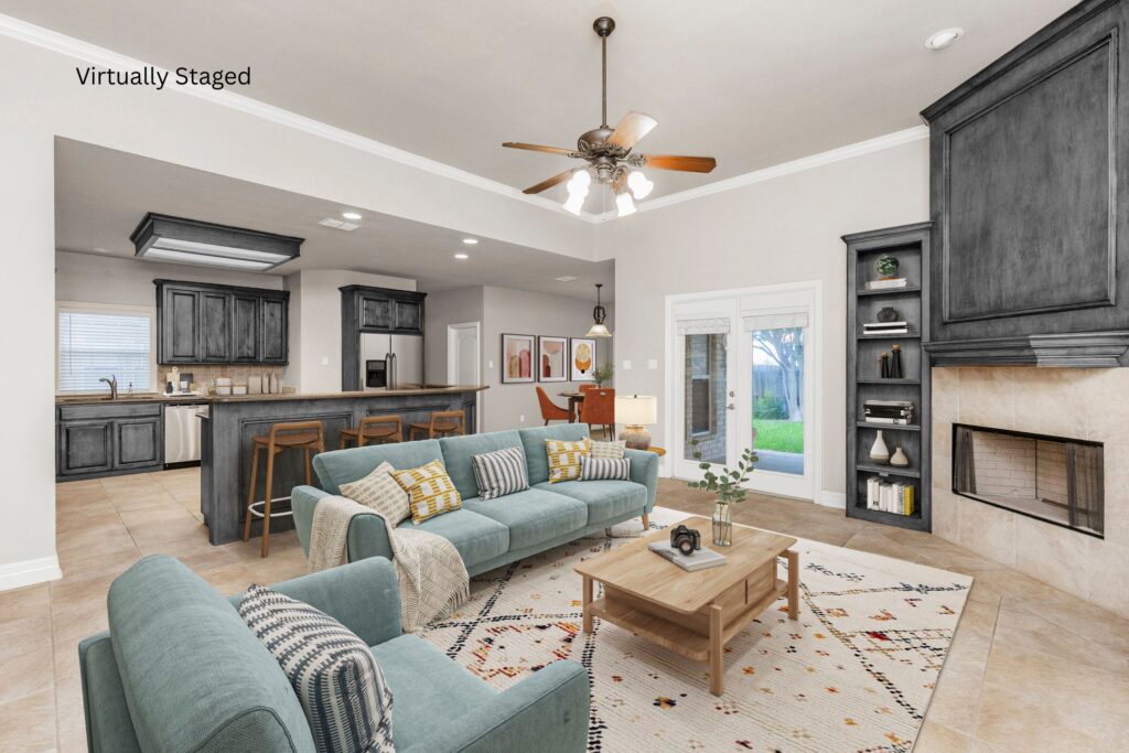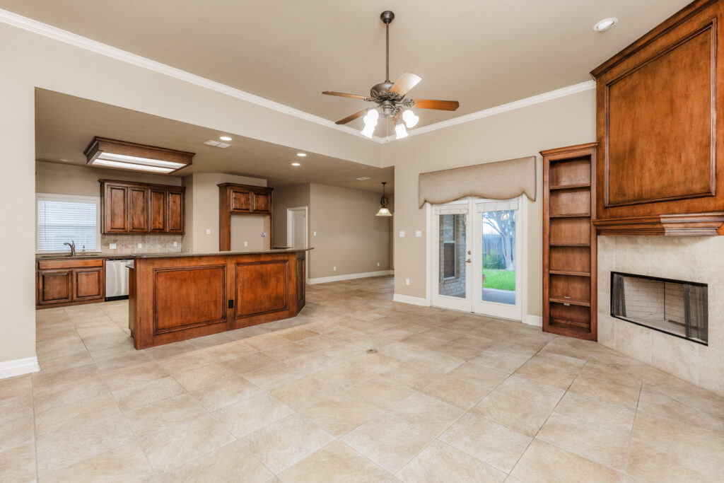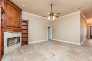 The cozy den, complete with a fireplace framed by built-in wood shelves, adds charm and warmth. Custom window coverings and stylish finishes elevate the home’s overall aesthetic.